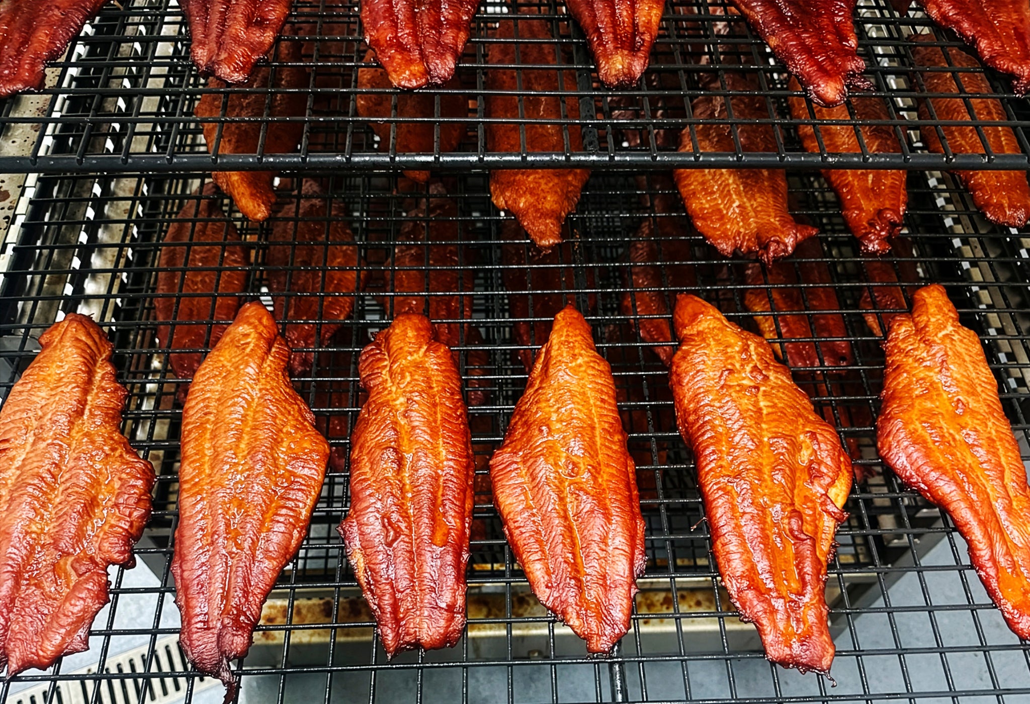 We apply a light cure then smoke our fish slowly over hardwood. The fish is hot-smoked—fully cooked, not just flavored. Temperature, airflow, and timing are critical. The result is a flavorful ingredient with a clean finish and firm texture.